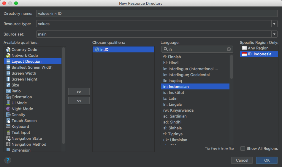 在 res 目录下新建一个 Android 资源目录,选择 locale 然后在列表里选择对应的国家语言后,命名后保存,系统就会帮我们生成符合要求格式的文件。