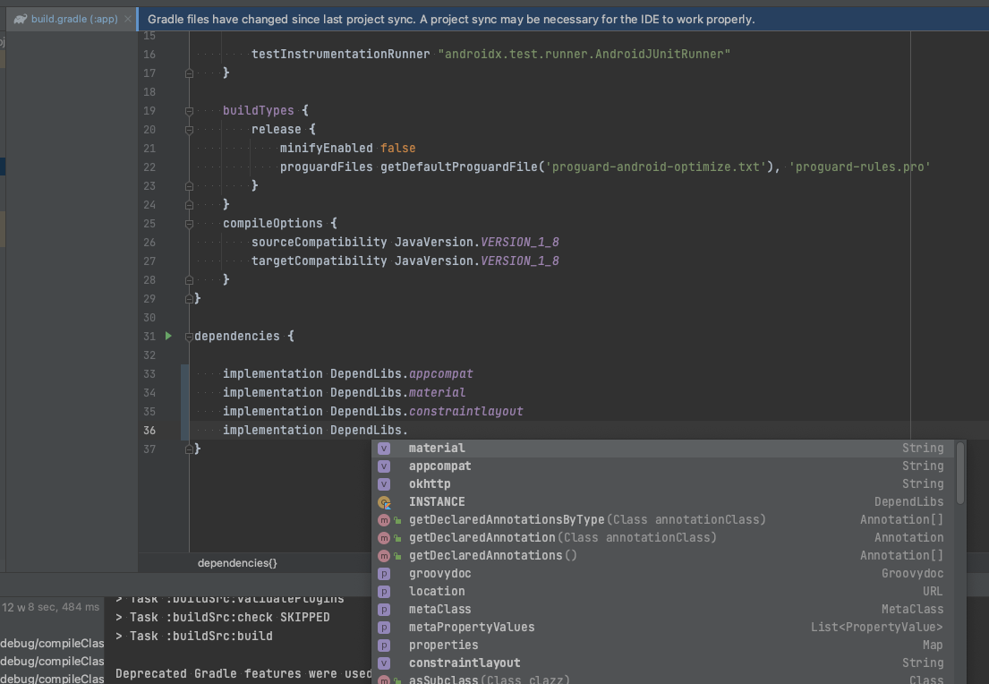 1 2 3 4 5 6 dependencies { implementation DependLibs.appcompat implementation DependLibs.material implementation DependLibs.constraintlayout implementation DependLibs.okhttp }